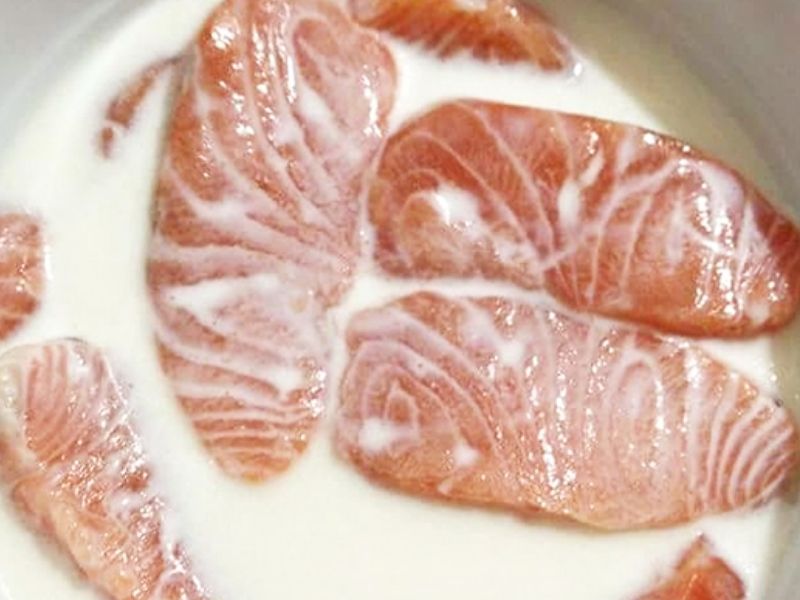 Sử dụng sữa tươi để khử mùi tanh của cá hồi thực sự rất phổ biến. Nghe có vẻ lạ phải không? Nhưng ở các nhà hàng lớn, các đầu bếp chuyên nghiệp không dùng gừng hay chanh mà dùng sữa tươi. Đổ sữa tươi ra tô lớn rồi cho cá hồi vào, để sữa tươi ngập mặt cá. Ngâm khoảng 3-5 phút rồi rửa sạch, khi đó cá sẽ không còn mùi tanh. Cách khử mùi tanh của cá hồi bằng sữa tươi rất nhanh và đơn giản, bạn nhớ sử dụng sữa tươi không đường nhé.