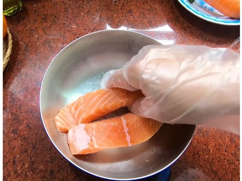 Cách ướp cá hồi để nấu cá hồi kho tộ rất đơn giản, cá đã rửa sạch thì bạn cho thêm 1 muỗng canh nước mắm xoa đều cá, sau đó ướp trong khoảng 20 phút để có được thấm gia vị.