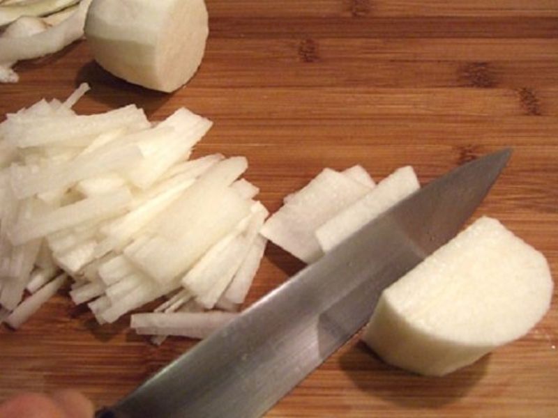 - Gọt vỏ củ cải, rửa sạch và thái sợi.