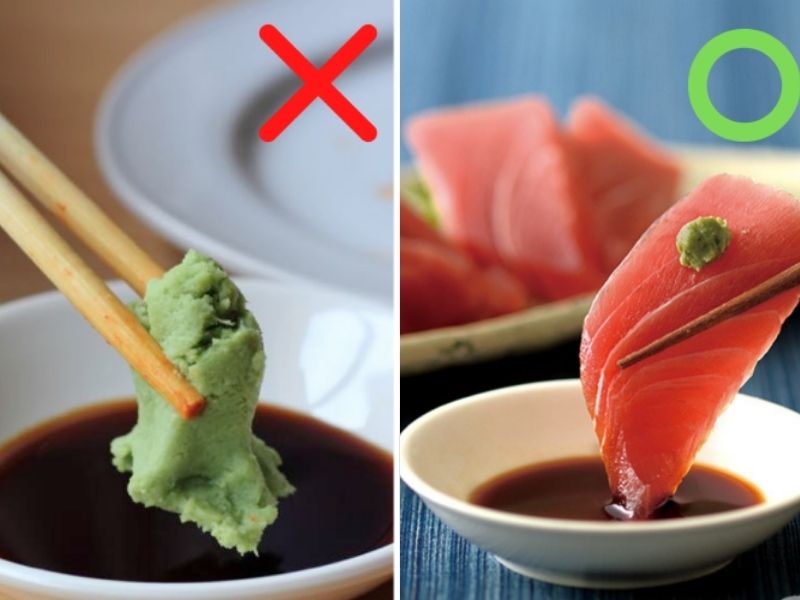 Đôi khi, người nước ngoài không phải người Nhật sẽ nhúng sashimi ngập trong nước tương. Cách ăn này hoàn toàn không đúng với phong cách của Nhật Bản. Bạn chỉ nên nhúng một góc nhỏ của sashimi vào nước tương là có thể ăn được.