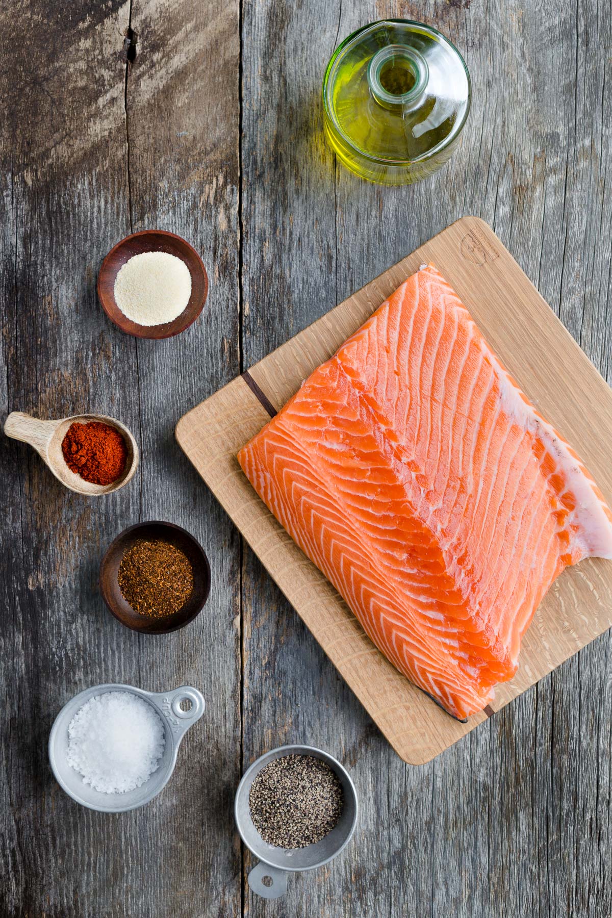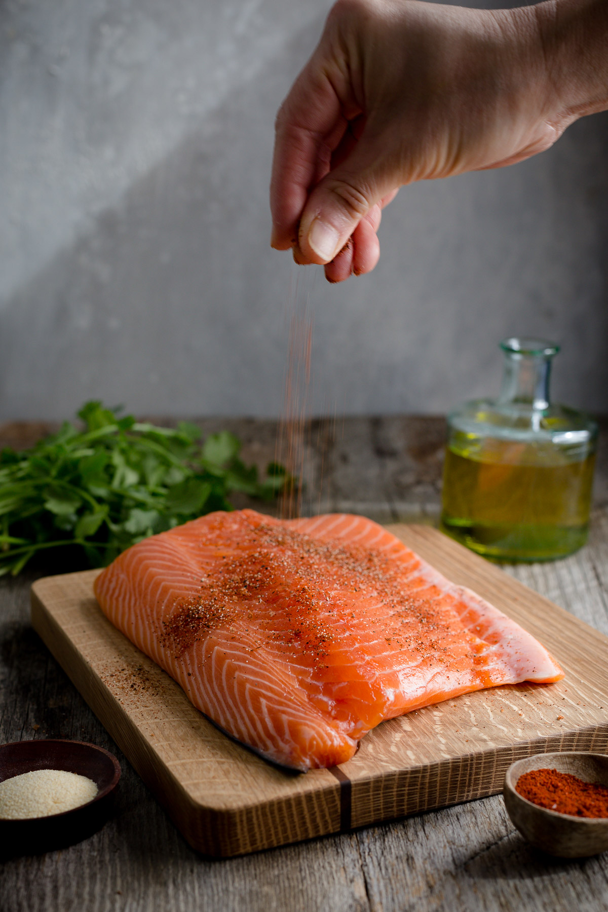 4 miếng phi lê cá hồi (~170g mỗi miếng) – nên giữ da để cá không bị khô khi nướng