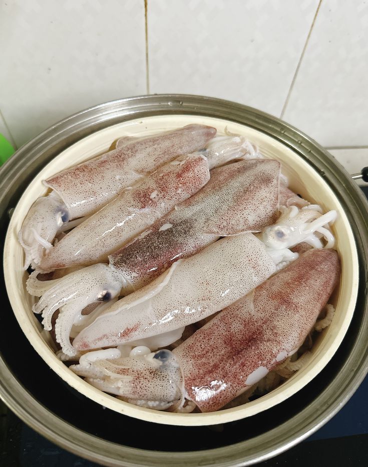 Luộc nhanh: Tùy kích thước mực, chỉ từ 30–60 giây. Mực to lâu hơn chút, mực nhỏ — càng nhanh. Quan sát thấy mực chuyển màu đẹp, săn chắc là được.