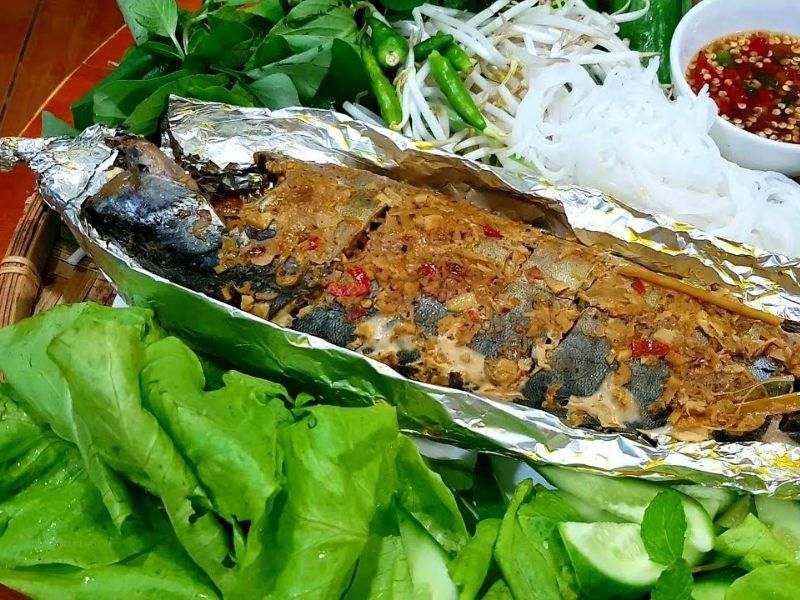 Sau khi cá chín, bày cá ra đĩa cùng với rau sống, bún, bánh tráng cuốn, chấm nước mắm chua ngọt hoặc mắm nêm. Trước khi ăn, mở giấy bạc ra và rắc một ít hành phi, đậu phộng rang băm nhỏ lên trên.