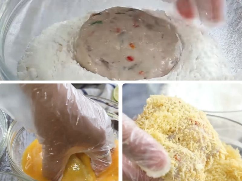 - Tiếp theo bạn tiến hành nhúng bạch tuộc qua lớp bột, rồi đến lớp trứng gà và cuối cùng là lớp bột chiên xù.