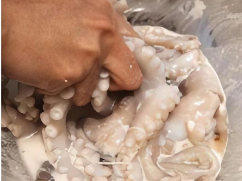 - Bạch tuộc sau khi được mua về thì ngâm với một xí nước muối đã pha loãng, vớt nước cốt chanh vào và bóp đều.