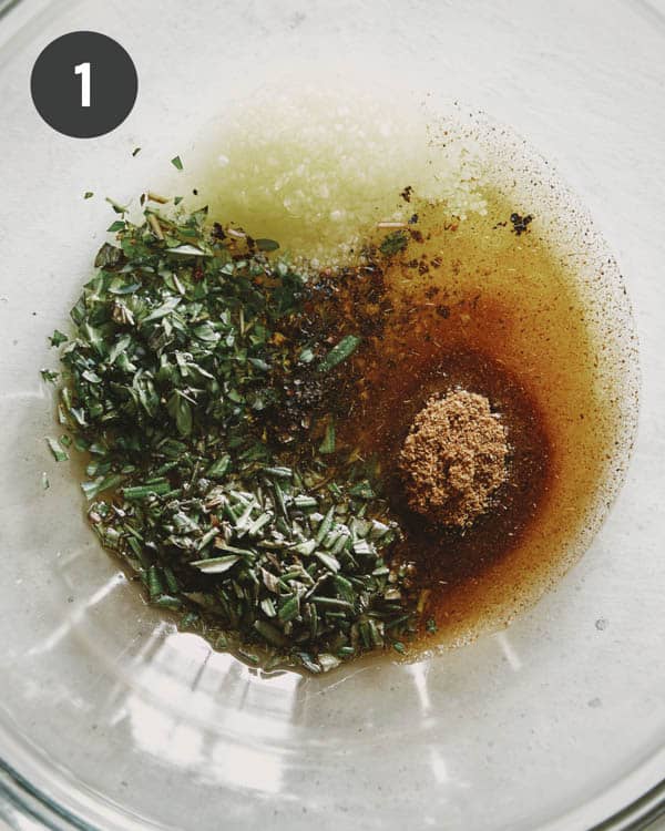Trộn đều dầu ô liu, rosemary, thyme, cumin, muối và tiêu trong một bát nhỏ.